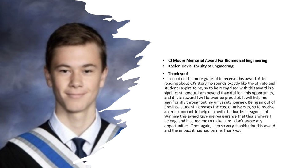 We honour the legacy of CJ Moore through the UofW CJ Moore Memorial Award for BioMedical Engineering. This award is designed for students who, like CJ, may not be at the top of their class academically, but show kindness, care, and a dedication to helping others. Join us in recognizing and supporting those who embody these values in the field of biomedical engineering.
